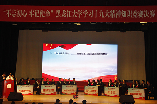 3月28日下午,“不忘初心牢記使命”黑龍江大學(xué)學(xué)習(xí)十九大精神知識(shí)競(jìng)賽決賽在音樂(lè)廳舉行,由生命科學(xué)學(xué)院、數(shù)據(jù)科學(xué)與技術(shù)學(xué)院、電子工程學(xué)院、經(jīng)濟(jì)與工商管理學(xué)院、法學(xué)院、信息管理學(xué)院輔導(dǎo)員教師代表和學(xué)生黨員代表組成的6支代表隊(duì)展開決賽的角逐。我校黨委書記劉德權(quán),黨委副書記蔣晶潔、丁宏,工會(huì)主席陳德明,學(xué)校...