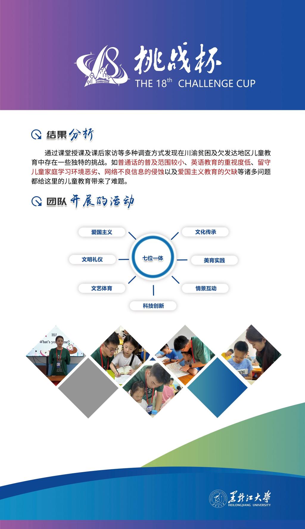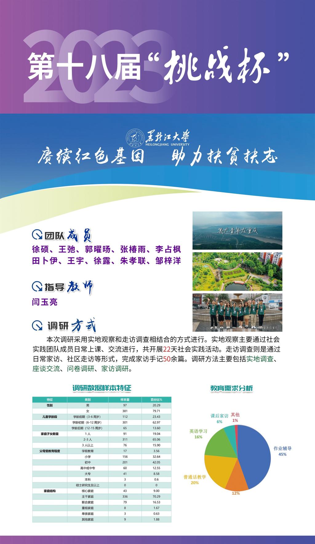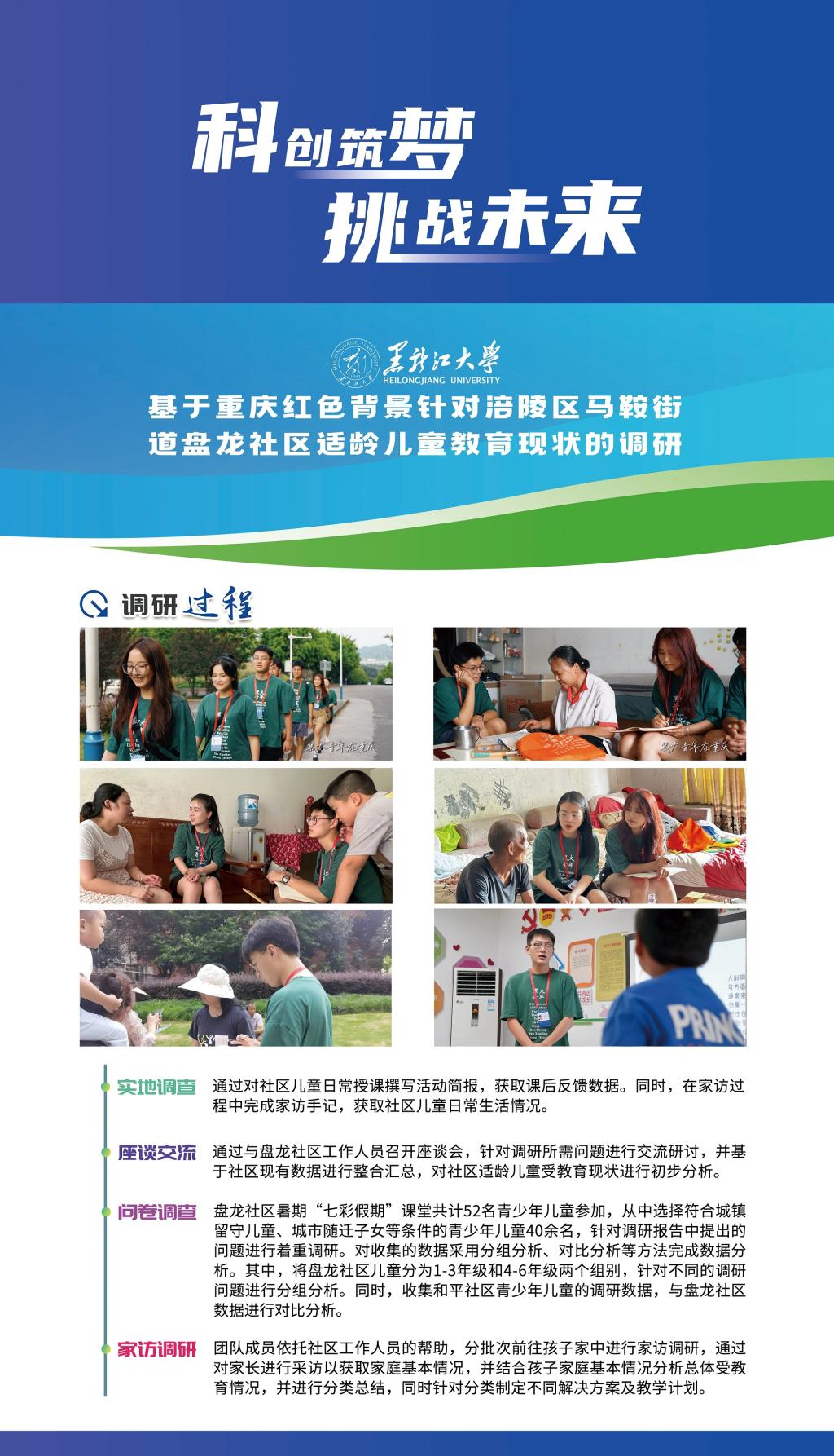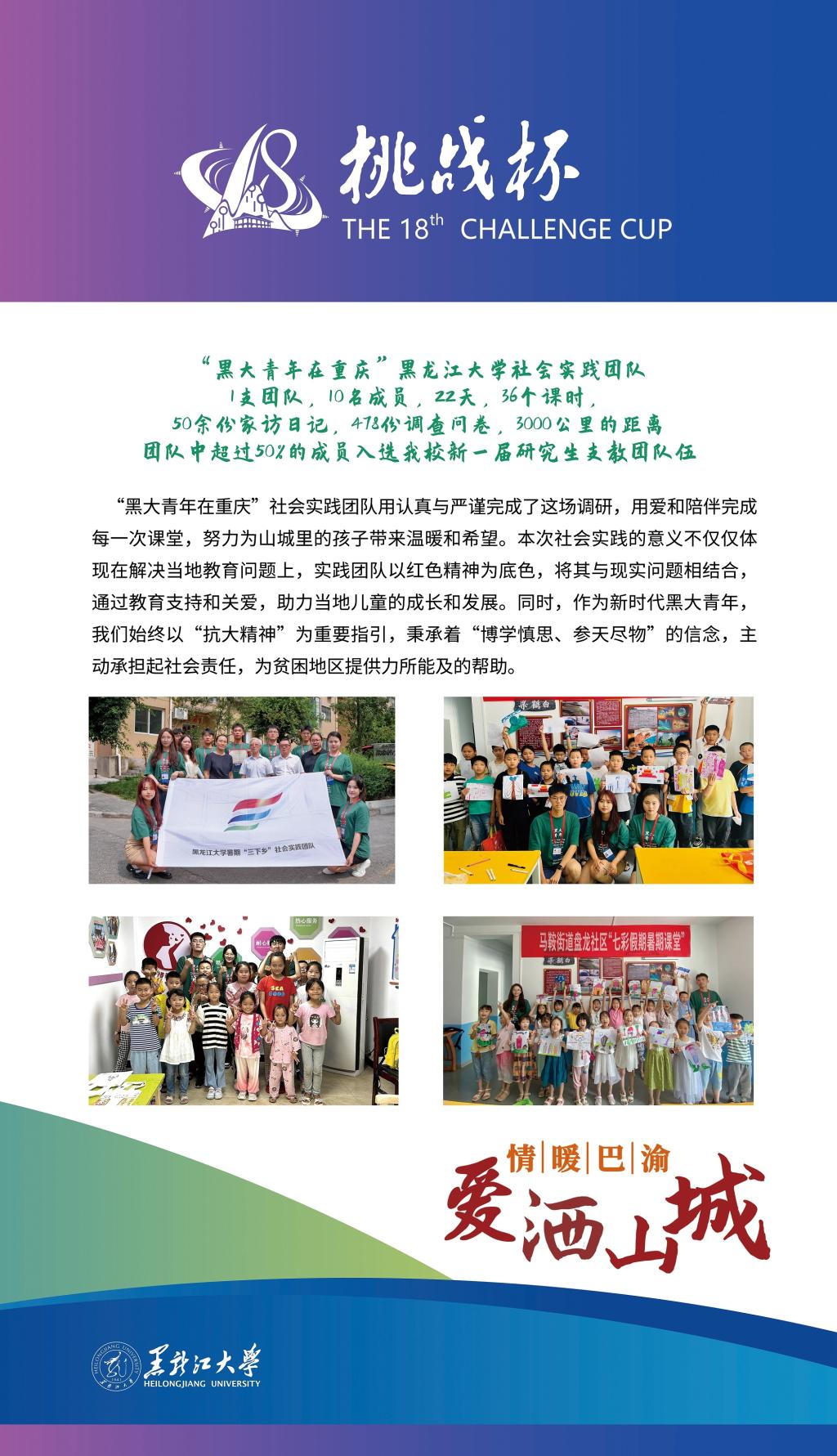 我校作品《賡續紅色基因 助力扶貧扶志——“七彩假期·黑大青年在重慶”黑龍江大學三下鄉社會實踐團隊基于重慶紅色背景針對重慶市涪陵區馬鞍街道盤龍社區適齡兒童教育現狀調研》在終審決賽中取得突破性成績,在紅色專項賽中經過現場答辯,榮獲一等獎,這是我校參加“挑戰杯”競賽以來首次獲得國家級一等獎,創造了我校參加“挑戰杯”競賽的最好成績,此項目也是黑龍江省本科高校參加“挑戰杯”紅色專項賽作品中唯一獲得一等獎的作品。此外,我校作品《鄉村振興背景下“新農村”發展路徑研究——以查罕諾村和扎龍村為例》獲得三等獎。