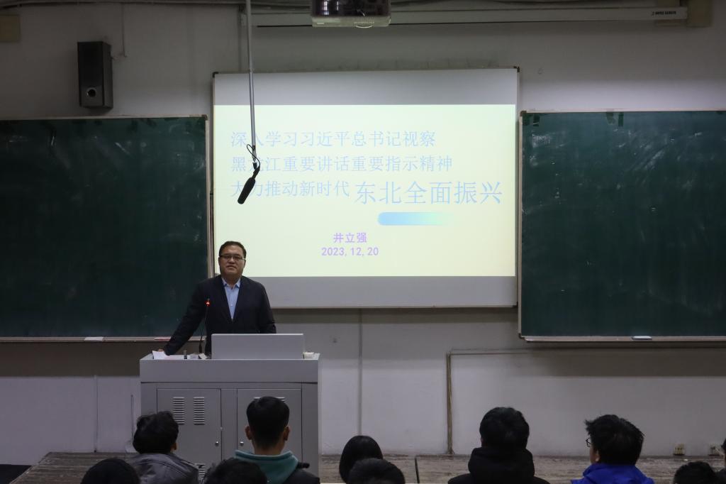 井立強圍繞學習貫徹習近平總書記在新時代推動東北全面振興座談會上的重要講話精神進行展開,深入、生動地講解了習近平總書記對東北全面振興取得成效、面臨形勢和機遇等方面。他號召同學們增強學習主動性,了解時事政治,培養獨立思維,努力踐行新時代大學生真善美強的高尚品格。