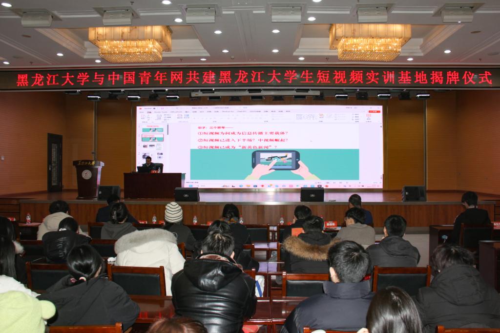 12月9日上午,黑龍江大學與中國青年網共建黑龍江大學生短視頻實訓基地揭牌儀式在主樓一樓報告廳舉行。副校長鐘衛東,中國青年網副總編輯王海,校黨委常委、宣傳部部長楊其濱,中國青年網地方業務中心、哈爾濱基地等相關同志,以及新聞傳播學院師生代表參加本次揭牌儀式。揭牌儀式由新聞傳播學院黨委書記、執行院長吳珩主持。