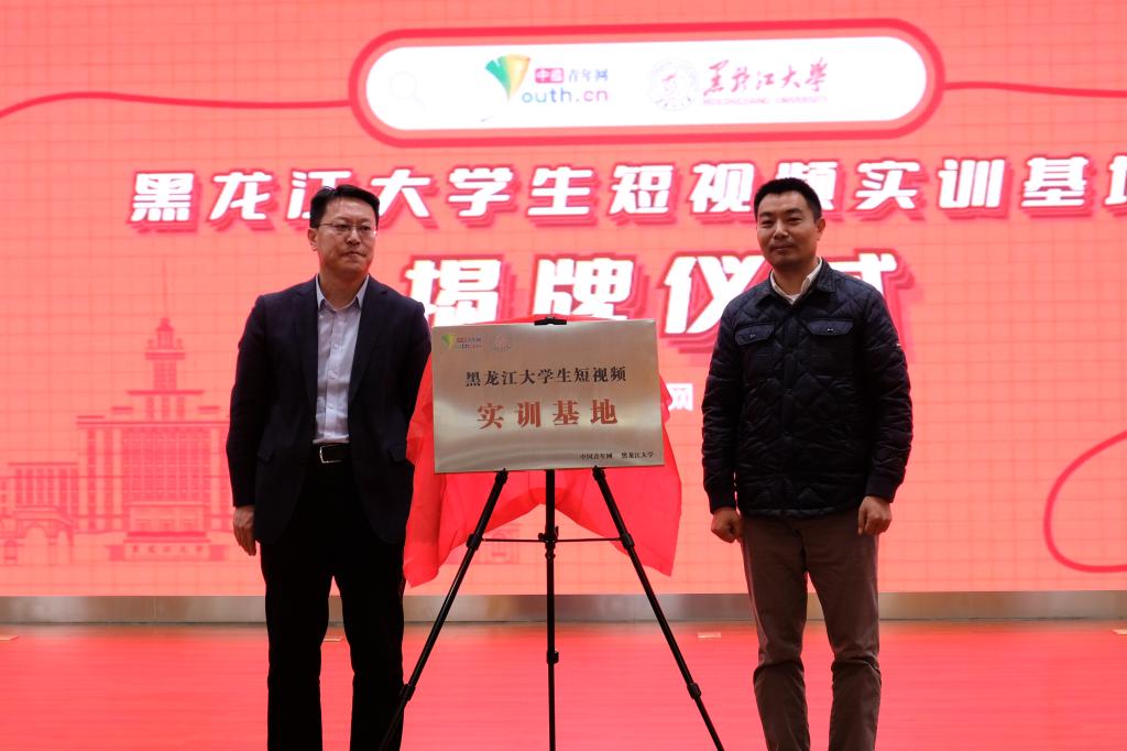 儀式上,鐘衛東與王海副總編輯共同為“黑龍江大學生短視頻實訓基地”揭牌。