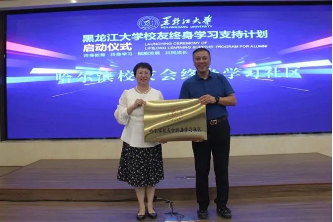 王敬波向“哈爾濱校友會終身學習社區”授牌,徐忠平代表哈爾濱校友會接受母校授牌。