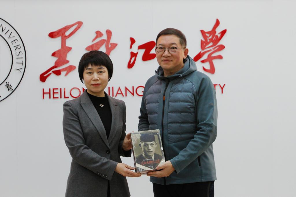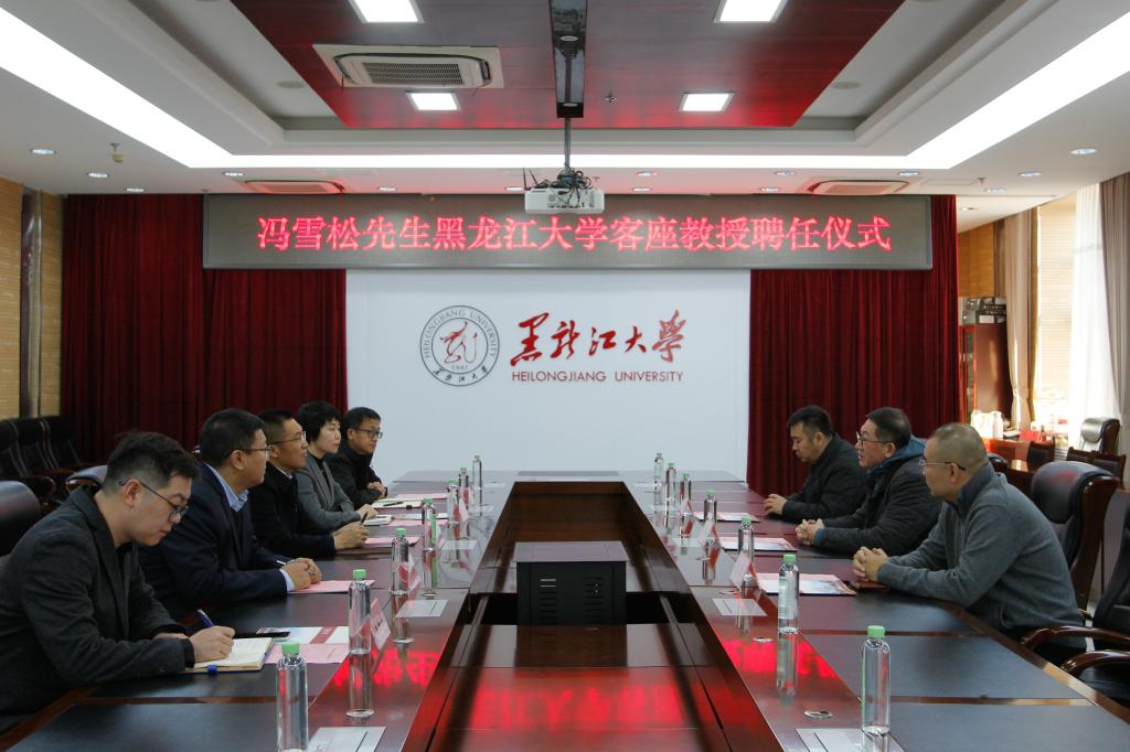 講座開始前,學校在主樓A802會議室舉行了馮雪松先生黑龍江大學客座教授聘任儀式并進行座談。與會雙方圍繞融媒體實驗室平臺建設、科研成果與優秀名師宣傳和相關主題策劃等方面達成了合作意向。校黨委書記遲寶旭為馮雪松頒發“黑龍江大學新聞傳播專業客座教授”“黑龍江大學新聞與傳播碩士專業學位行業導師”聘書,校黨委副書記劉鳳影接受馮雪松先生贈書。