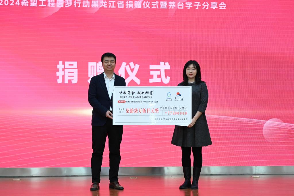 在捐贈儀式上,貴州茅臺和中國青基會向黑龍江省青基會捐贈77.5萬元善款,為我省4所高校、28個縣區的155名考入大學的困境家庭新生提供每人5000元助學金,幫助他們解決從“家門”到“校門”的困難。