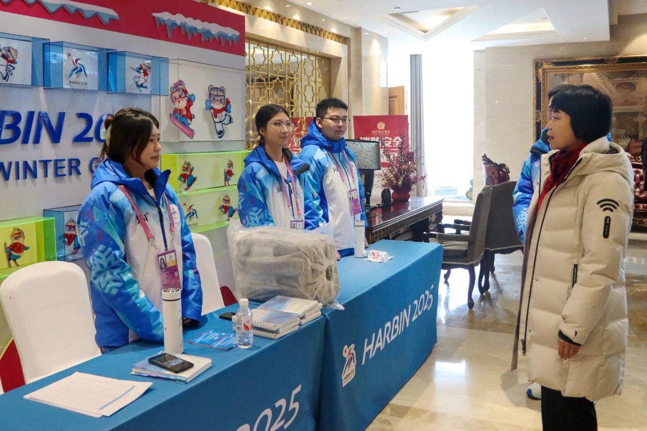 劉鳳影一行先后前往新巴黎大酒店、漢庭酒店、主新聞中心、國際廣播中心和開閉幕式場館,詳細了解志愿服務工作的整體情況,詳細詢問了每一位志愿者的工作內容、生活狀況,并為志愿者們送上了精美的慰問禮品,鼓勵他們用熱忱積極的態度投身志愿服務,以最高標準完成亞冬會志愿服務工作。