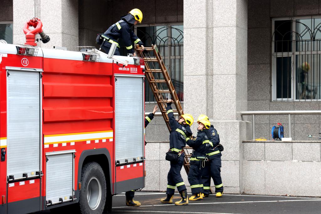 陳維厚宣布演練正式開始?;顒邮紫饶M教學樓火情處置場景。隨著消防警報的拉響,實驗樓冒出濃煙,同學們彎腰低姿,用毛巾捂住口鼻,沿著指定路線撤離到安全區域。整個過程快速有序,達到預期目標。消防救援展示環節,由消防救援人員操作噴霧水炮消防車向同學們展示高空噴射演示。