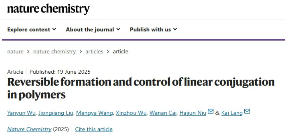 近期,我校郎凱教授和牛海軍教授所帶領(lǐng)的研究團(tuán)隊,在Nature Chemistry上發(fā)表題為“Reversible Formation and Control of Linear Conjugation in Polymers”的研究論文。這是黑龍江省屬高校作為第一完成單位的成果首次登上《自然?化學(xué)》,是我校科學(xué)研究取得的又一次歷史性重大突破。郎凱老師作為我校從美國引進(jìn)回國的優(yōu)秀學(xué)者,是我校實施“人才強校戰(zhàn)略”的優(yōu)秀代表。