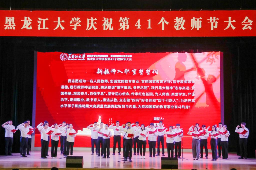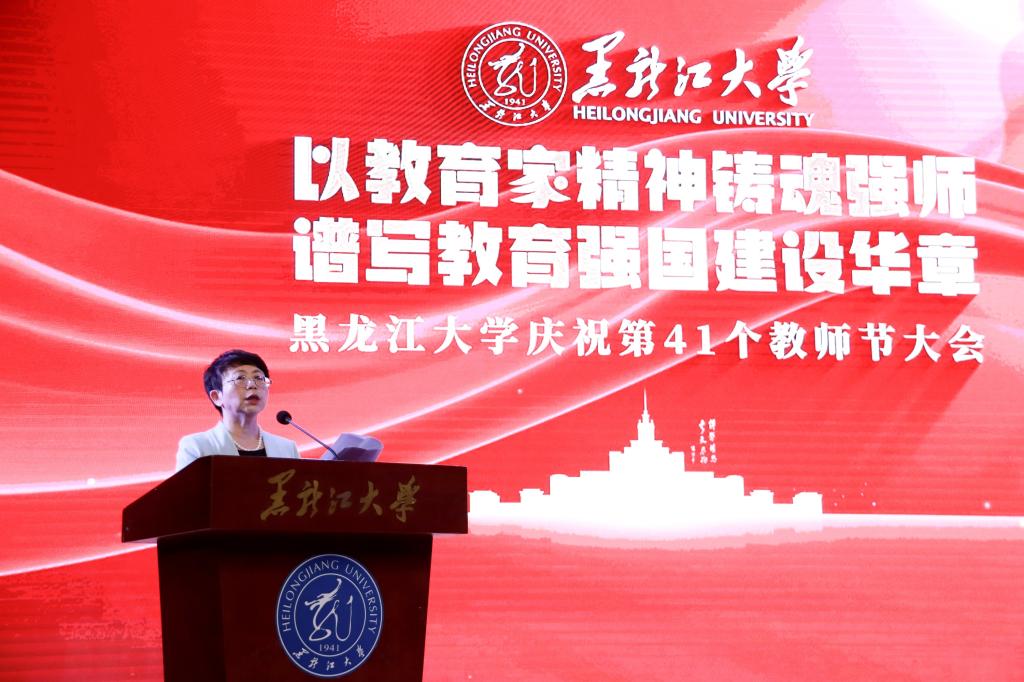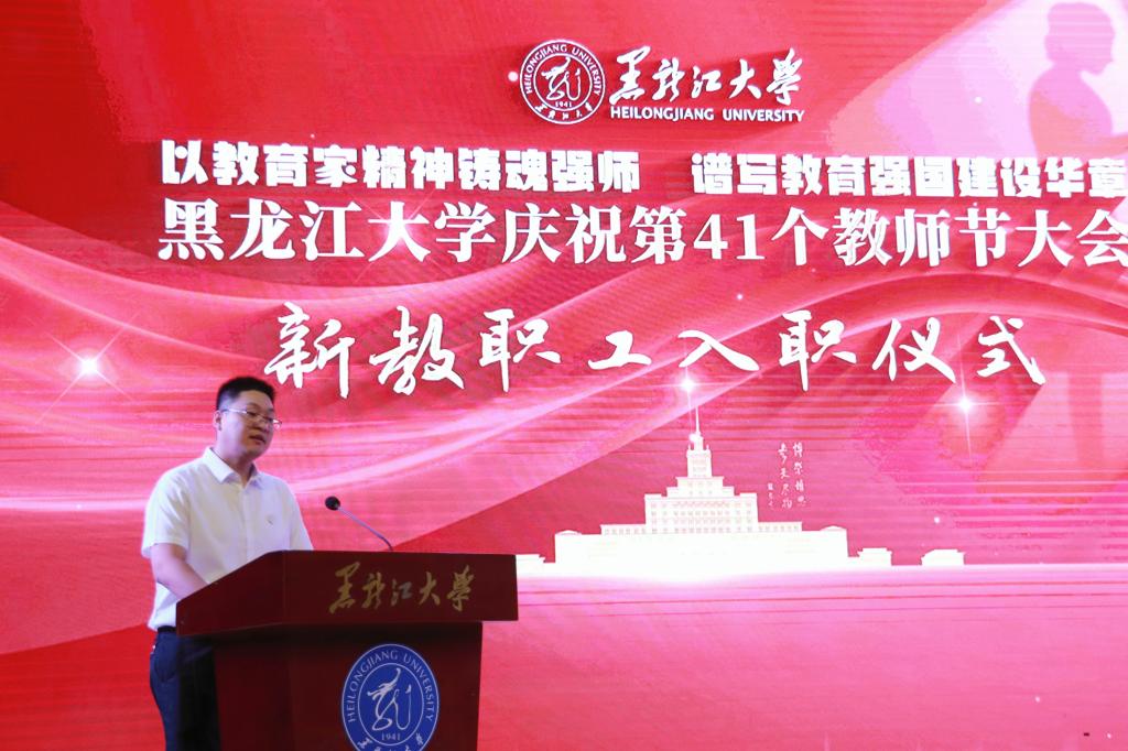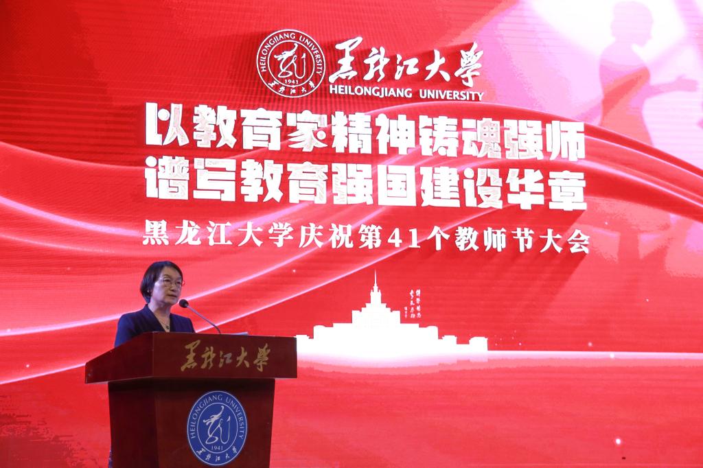 校長王敬波致辭。她向全校教職工致以節日問候,向老教師、老前輩們致以敬意,向新入職的各位教職工致以歡迎。王敬波表示,教育家精神是對教育初心的永恒守望,是對學問真理的上下求索,是對學子生命的深切關懷,是對教育使命的勇毅擔當。她號召,全體教職工要堅守立德樹人初心,擔當為黨育人、為國育才使命,在黑大這片熱土上、在教育的長路上,共同書寫教育報國的壯麗詩篇。