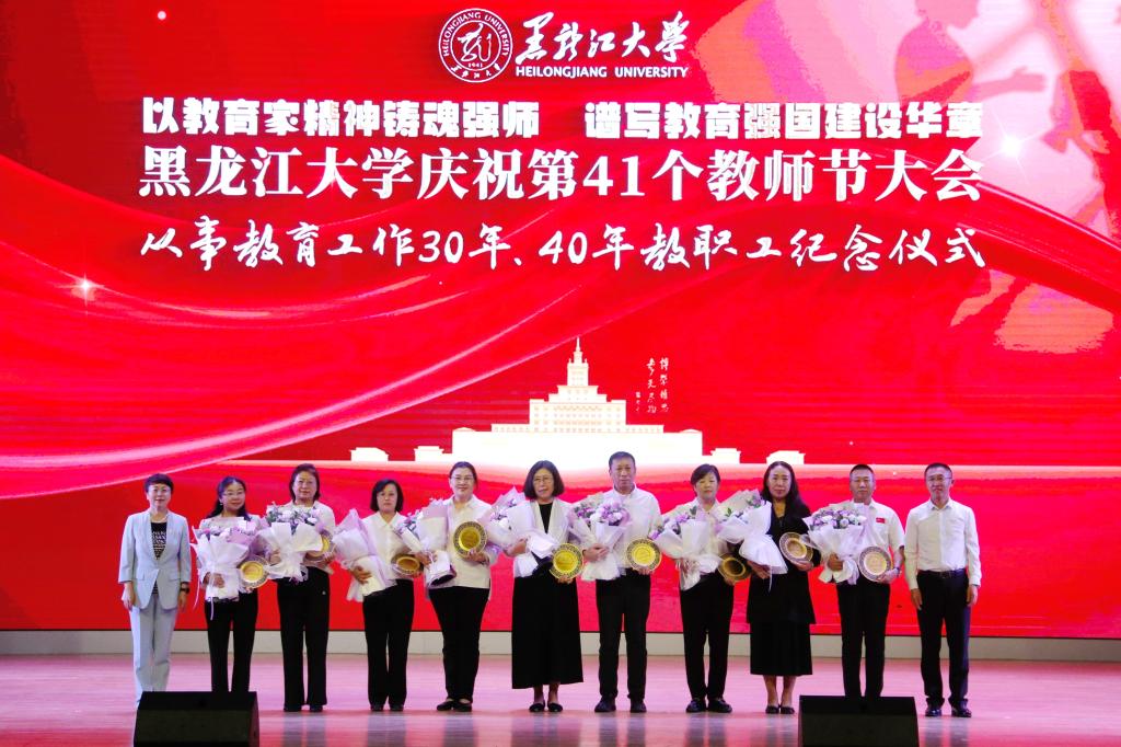 在學校84年的辦學歷程里,一代代黑大人薪火相傳、躬耕教壇、佳績頻出,他們在育人陣地上默默耕耘。在退休教職工榮休儀式上,校黨委書記遲寶旭、校長王敬波為榮休教師代表頒發紀念牌。