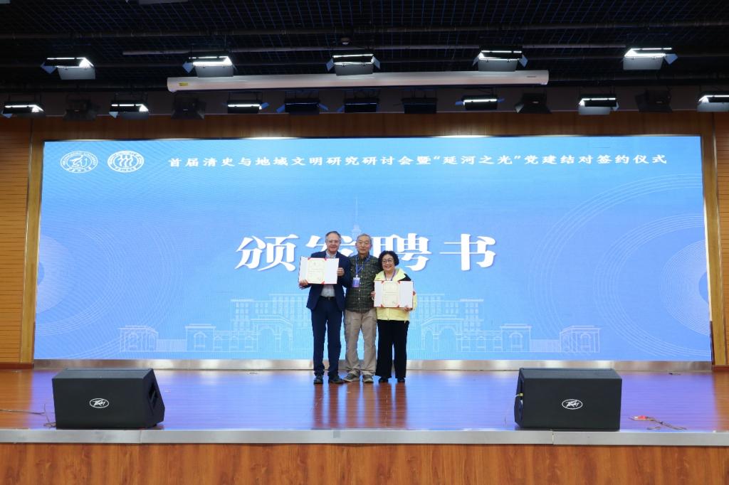 中國清史北方研究院名譽(yù)院長劉小萌為倫敦大學(xué)亞非學(xué)院勞曼教授與中國第一歷史檔案館張莉研究員頒發(fā)中國清史北方研究院研究員聘任證書。