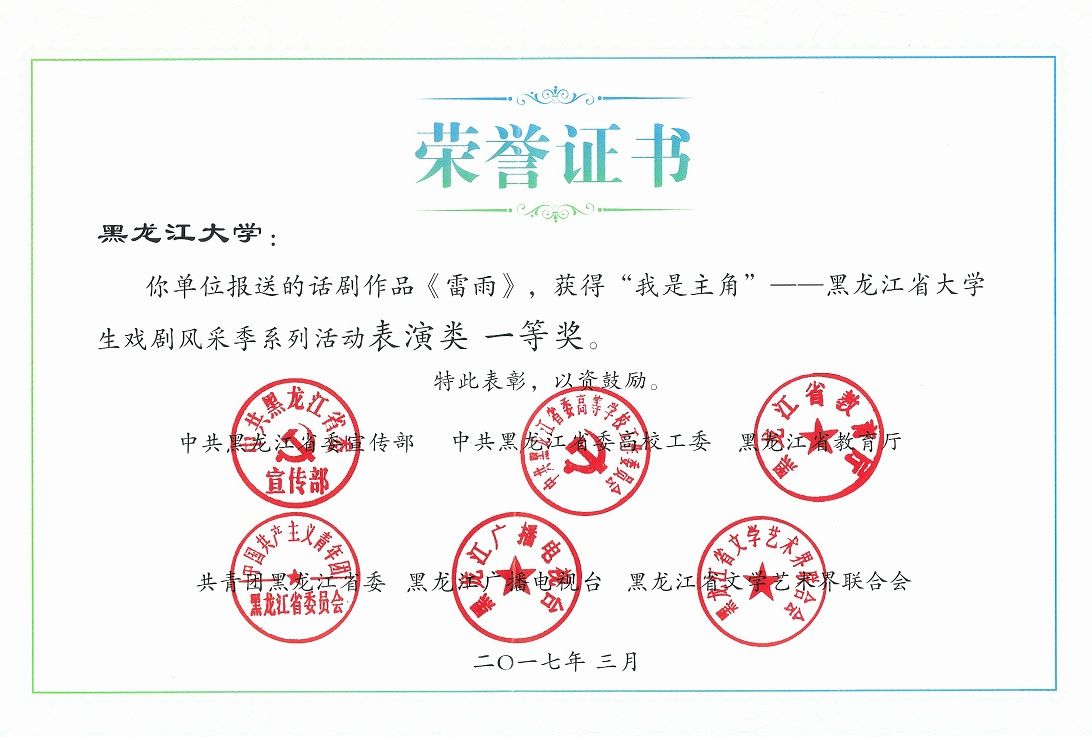2017年3月,我校文學院中國語言文學實踐教學中心幕啟戲劇社排演的實踐教學劇目《雷雨》在省委宣傳部、省委高校工委、省文化廳、省教育廳、省團委、省文聯、黑龍江廣播電視臺等單位共同舉辦的《“我是主角”——黑龍江省大學生戲劇風采季系列活動》評選中榮獲表演類一等獎。