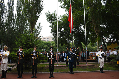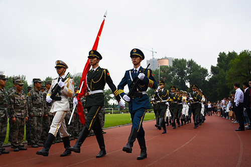 早七點,由藝術學院學生合唱團領唱、學生軍樂團伴奏,全體師生齊唱校歌。伴隨著《歲月如歌》的悠揚旋律,大學的美好時光成為記憶的定格。隨后,全體肅立,升起國旗,奏唱國歌,向為民族獨立,國家富強做出貢獻的英雄們致敬,向親愛的祖國獻上最美好的祝愿。