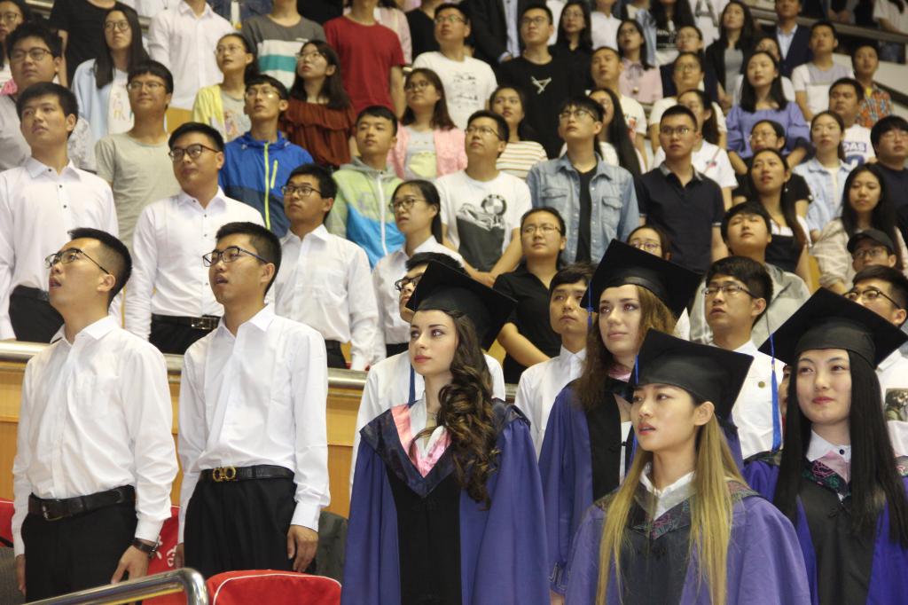 在雄壯的國歌和激昂的校歌中,國旗和校旗冉冉升起,2017屆畢業生畢業典禮正式開始。