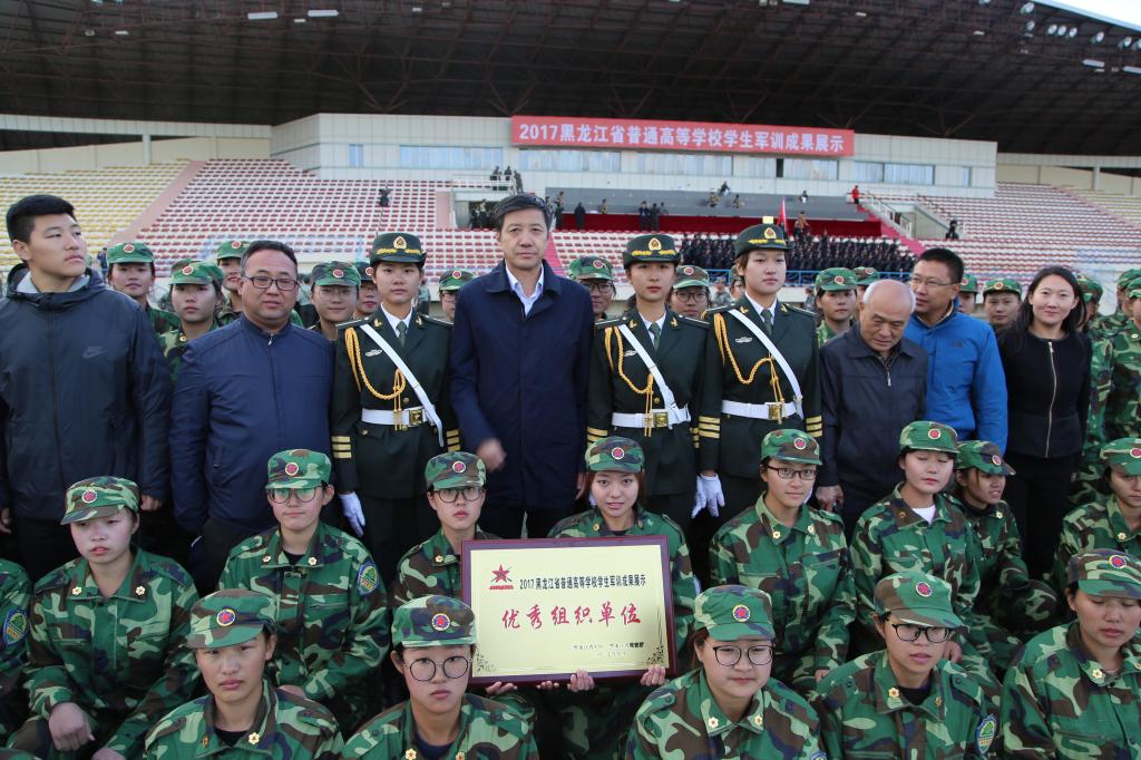 各項軍訓成果展示結束后,大會對2017黑龍江省普通高等學校學生軍訓成果展示優秀組織單位、先進承訓部隊進行了表彰,我校受到大會的表彰,被授予“2017黑龍江省普通高等學校學生軍訓成果展示優秀組織單位”。最后,省政府副秘書長邢愛國、省軍區副司令員邱月潮少將分別做了講話。