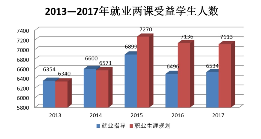 近五年,學校積極構建并完善了以《職業生涯涯規劃與就業指導》課程為主渠道,以就業指導賽事和活動為輔助,以職業咨詢為著力點的精細化就業指導服務體系。培養了一支由學生管理者、專業教師和企業人員組成的結構合理、專業精良的師資隊伍,其中副處級、副高級職務及企業經理級別師資約占67%左右。每年選課學生數達到12000人以上。其中“職場訓練營”、“職業生涯規劃與職場模擬大賽”等活動影響力不斷擴大,每年參與學生人次近5000人,脫穎而出的學生近百人,成為推出優秀學生和提升學生職業能力的重要平臺。