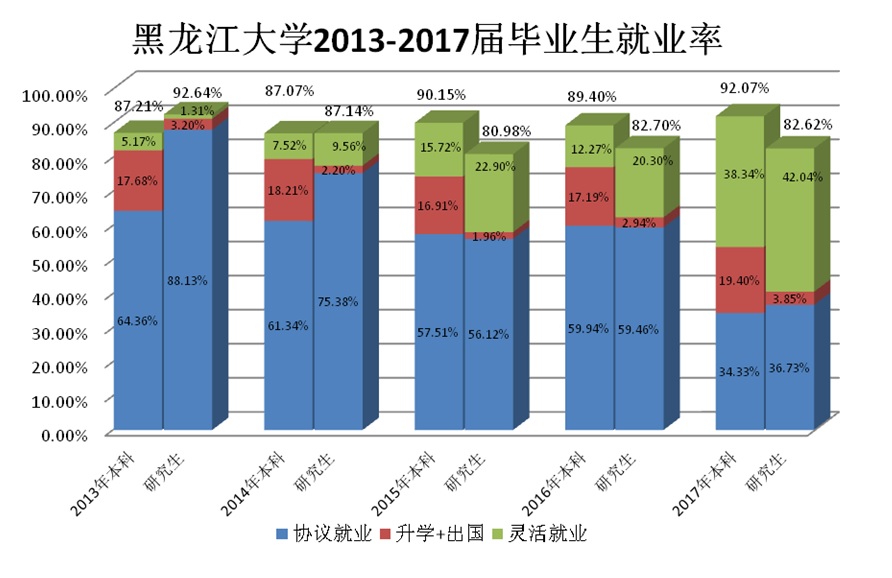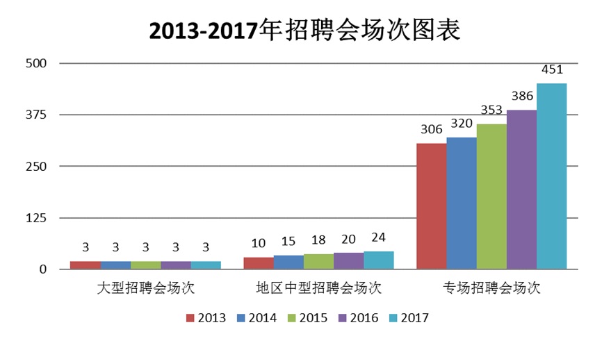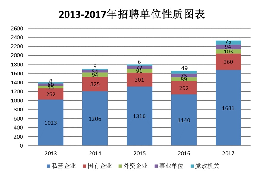 近五年學校通過“走出去,請進來”積極開拓省內外就業市場,以“優質服務和優秀的畢業生質量”創出黑龍江大學品牌,彰顯學校影響力。市場區域分布結構更科學,地區覆蓋珠三角經濟區、長三角經濟區、長江經濟帶、渤海灣京津冀經濟區、沿海開放城市,尤其江蘇省、浙江省各區市,連續12年到校招聘。招聘會層次更多元,學校每年精心組織召開大型、中型、專場、行業和校友招聘會,年招聘會場次達470余場。招聘崗位更充足,從2013年的年招聘崗位24658增長到2017年35867,供需比達1:4。招聘單位質量更優質,招聘單位國企占比由2013年的252家增長為2017年360家,民營企業從1 023家增長到1681家。知名企如碧桂園、58同城、中糧集團、IBM、亨通集團、恒大集團、格力電器、哈飛集團、哈空調集團和朝陽企業如深圳卓越物業、大連金瑪集團等逐年增多。