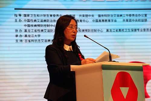 中國性病艾滋病防治協(xié)會秘書長王新倫在講話中肯定了我校在防艾工作中的熱情與責任,并指出,青春時期正是大學生形成三觀之時,準確把握防控艾滋病的觀念與知識有利于形成防艾的良好氛圍。她號召大學生們貢獻自己的創(chuàng)意、激情,積極參與到抗擊艾滋病的行動中,讓艾滋遠離校園,遠離青春。