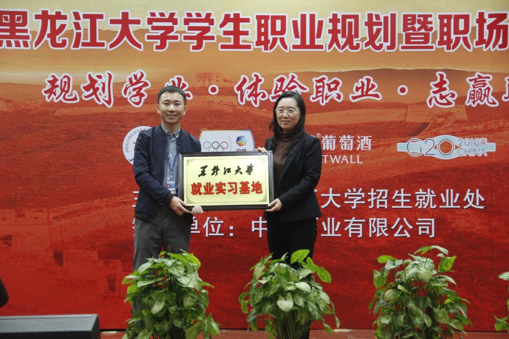 晚六點,決賽正式拉開帷幕。中糧酒業有限公司東北分公司總經理周立波先生作為冠名方代表為大賽致辭,他回顧了中糧酒業有限公司與黑龍江大學的合作歷程,分享了作為一名黑大校友多年后重回母校的榮幸和欣慰,更表達了愿意以職業規劃大賽這一品牌活動為契機,進一步深化校企合作模式,繼續為母校提供實習實踐機會的良好希冀。隨后,丁宏副書記向中糧酒業有限公司頒發“黑龍江大學就業實習基地”銅牌,中糧酒業有限公司丁巖先生代表公司接受銅牌。