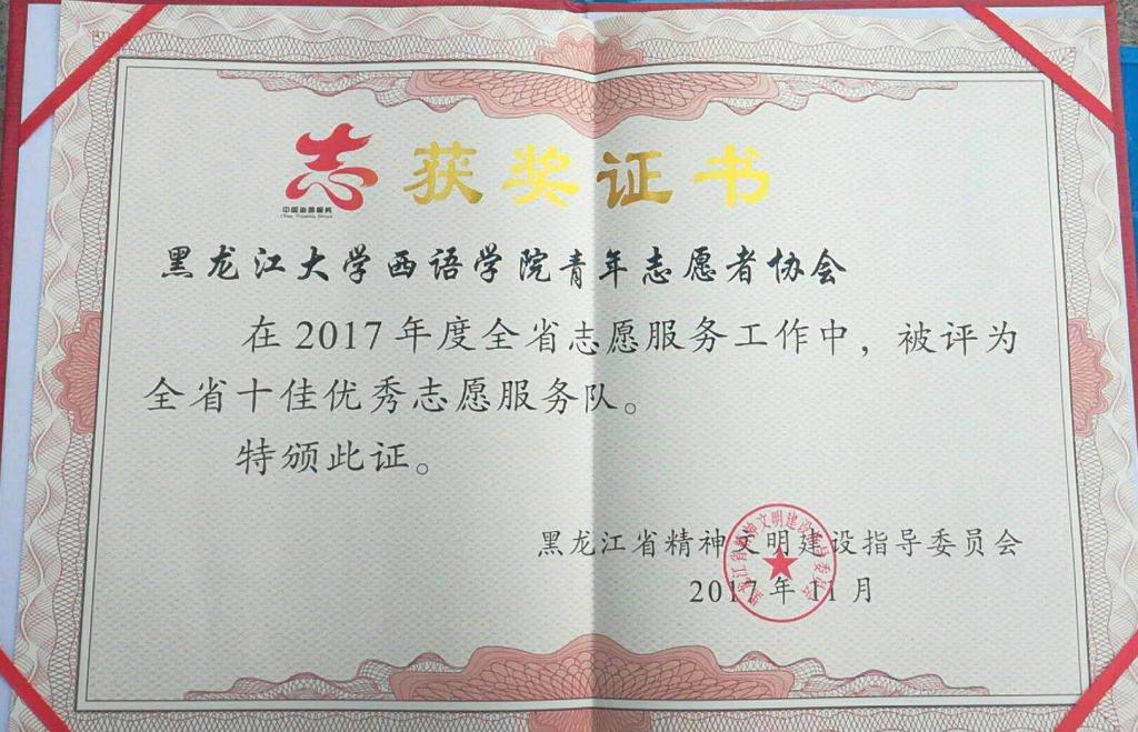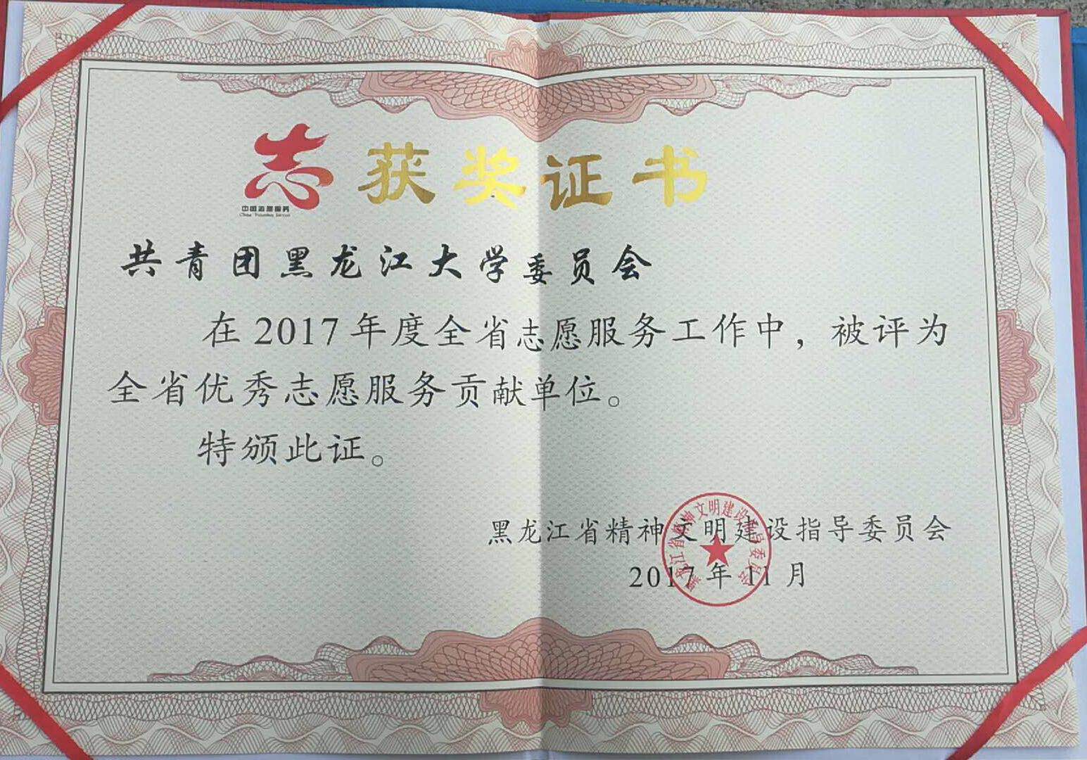 為大力弘揚奉獻、友愛、互助、進步的志愿精神,按照中央文明辦和省文明委2017年工作安排,黑龍江省精神文明建設指導委員會開展了2017年度全省志愿服務“五個100”先進集體和個人評選工作,我校是全省獲獎數量最多的高校之一。經過申報和專家評審等環節,我校團委被授予“全省優秀志愿服務貢獻單位”榮譽稱號;西語學院青年志愿者協會被授予“全省十佳優秀志愿服務隊”榮譽稱號;化學化工與材料學院被授予“全省優秀學雷鋒志愿服務工作站”榮譽稱號;計算科學技術學院、軟件學院“伴你成長,陪你變老”志愿服務項目被授予“全省優秀志愿服務項目”榮譽稱號。
