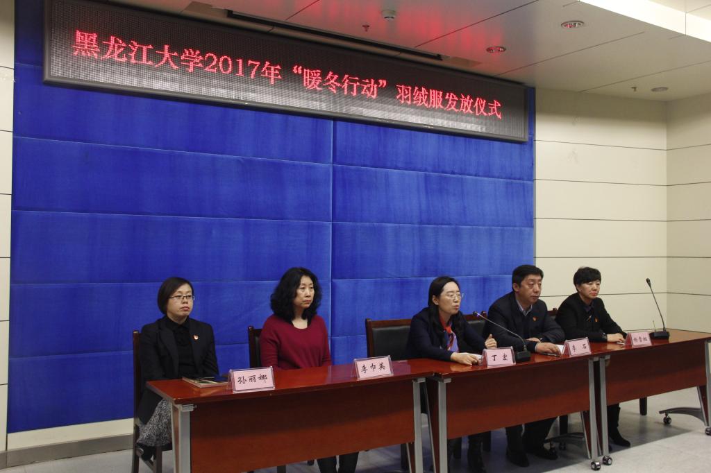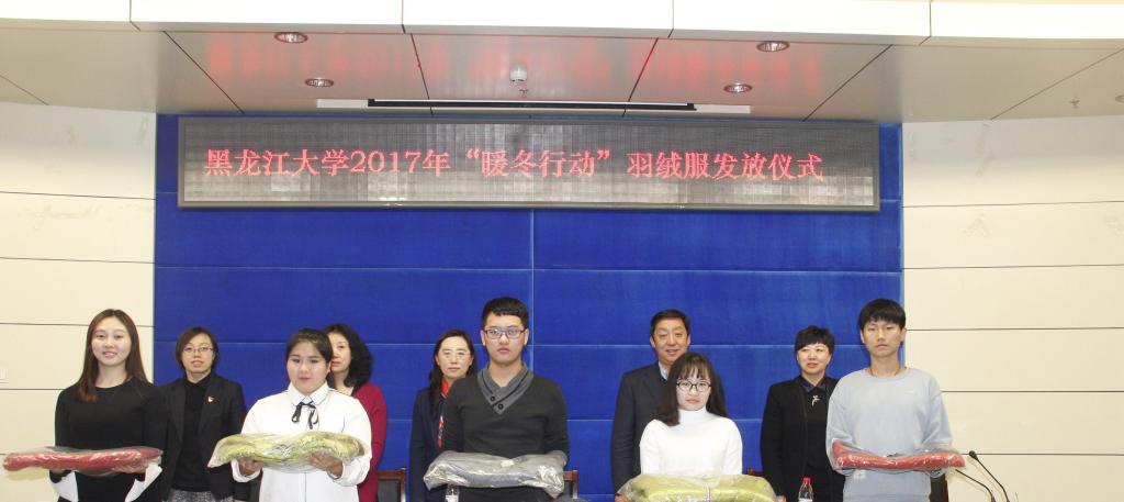 12月20日下午4時,我校在主樓A座226室舉行2017年“暖冬行動”羽絨服發放儀式。校黨委副書記丁宏,學工部部長李石、副部長李巾英、楊雪虹、孫麗娜,受助學生代表以及輔導員代表出席了發放儀式。本次活動是由哈爾濱美羅灣醫院和北京青愛教育基金會共同發起,由哈爾濱美羅灣醫院出資10萬元為我校家庭經濟困難學生購買羽絨服。