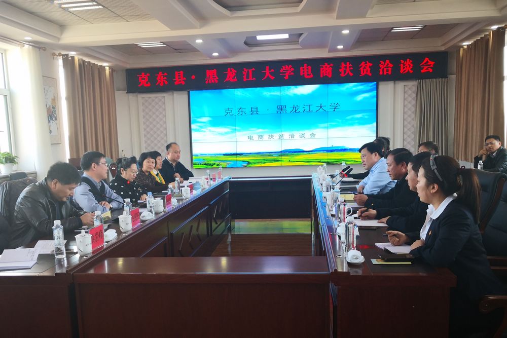 在電商扶貧工作座談會上,黑龍江大學專家團隊與克東縣電商辦、兢東電商學院負責同志進行了廣泛的經驗交流。信息管理學院院長黃麗霞、科學技術處副處長孫來軍、信息管理學院電子商務專業教授楊艷結合克東縣電商發展現狀,從人才培養方案設計、師資選用、實踐實訓、營銷推廣及合作形式等方面入手,對克東縣如何構建、完善三級服務、三產融合、科技支撐、節點營銷、產業項目等電商發展平臺提出了有針對性的意見和建議。