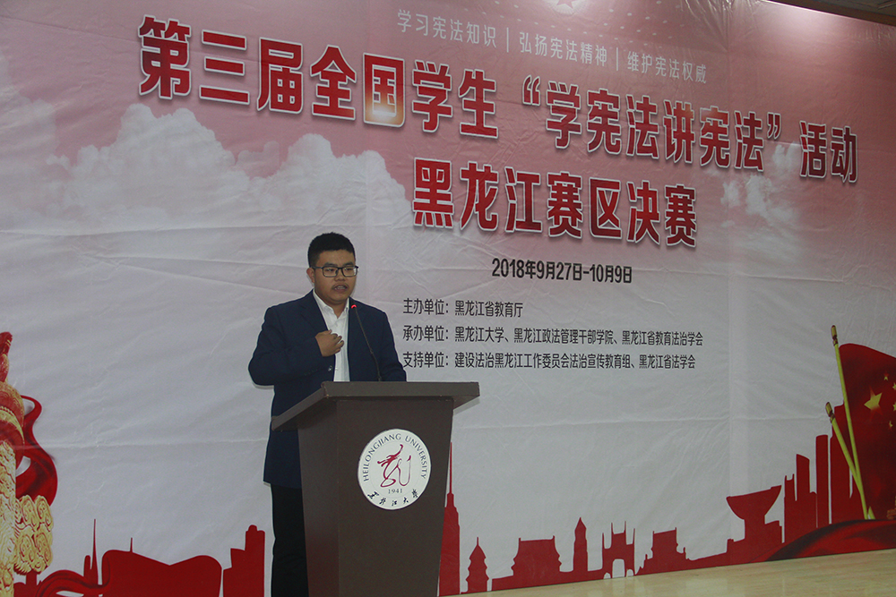 10月9日上午,由黑龍江省教育廳主辦,黑龍江大學、黑龍江省政法管理干部學院、黑龍江省教育法治學會聯合承辦,建設法制黑龍江工作委員會法制宣傳教育組、黑龍江省法學會協辦的第三屆全國學生“學憲法講憲法”演講比賽黑龍江賽區(中小學組)決賽在我校陽光講壇舉行。