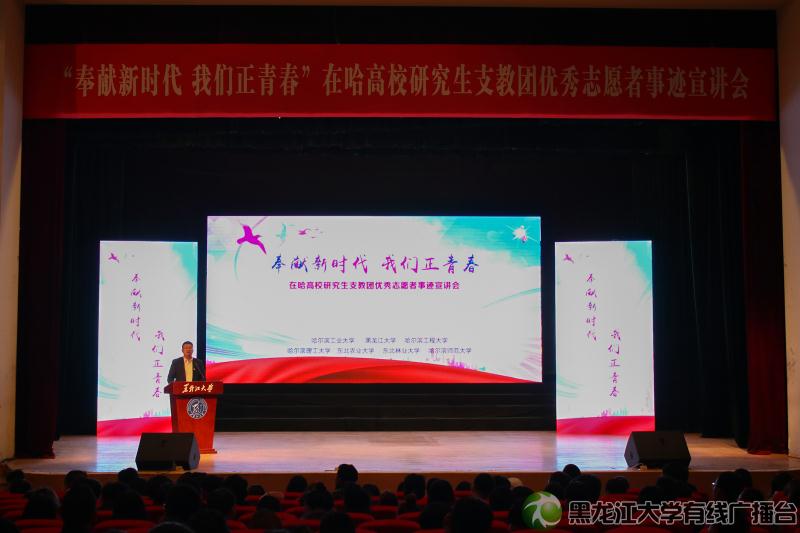 本次宣講會是為深入學習宣傳貫徹習近平新時代中國特色社會主義思想和黨的十九大精神,落實團的十八大關于深入實施大學生志愿服務西部計劃的工作部署和團中央書記處關于繼續抓實抓好研究生支教團工作的相關要求,加深青年學生對研究生支教團的認識,總結、展示在哈高校研究生支教團工作成績和優秀成果,紀念中國青年志愿者扶貧接力計劃研究生支教團啟動實施20周年,大力弘揚奉獻、友愛、互助、進步的志愿服務精神,由黑龍江大學發起并聯合哈爾濱工業大學、哈爾濱工程大學、東北農業大學、東北林業大學、哈爾濱理工大學、哈爾濱師范大學等兄弟高校開展的。