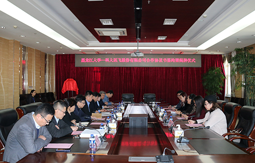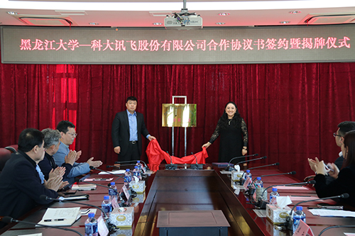 隨后,簽約儀式開始。科大訊飛吉龍公司總經理徐藝華與我校副校長嚴明簽署《黑龍江大學科大訊飛股份有限公司共建黑龍江大學—科大訊飛聯合實驗室合作協議書》,共同為聯合實驗室揭牌。會后,雙方代表合影留念。