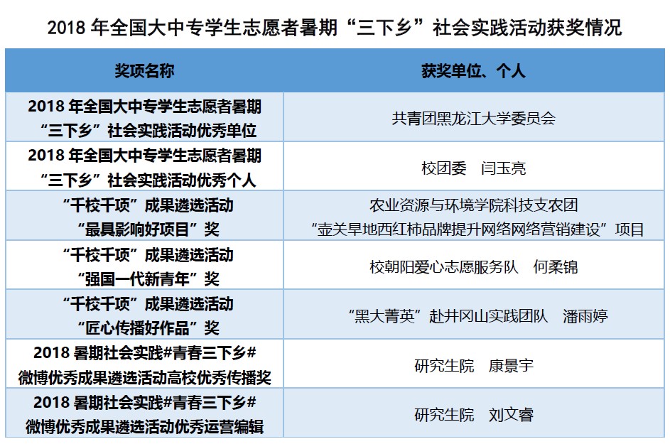 為推進暑期大學生“三下鄉”社會實踐活動持續深入開展,在實踐育人中發揮更加突出的作用,引領大學生在社會實踐中受教育、長才干、作貢獻,團中央學校部、全國學聯秘書處開展了2018年全國大中專學生志愿者暑期“三下鄉”社會實踐活動優秀集體和個人總結通報工作及“千校千項”成果遴選活動,我校多個項目、團隊和個人獲獎。