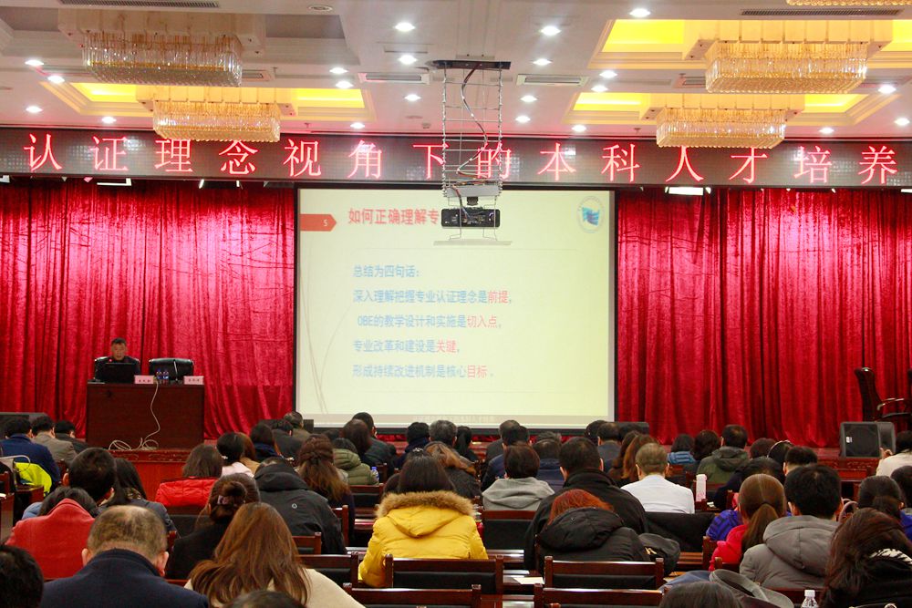 王長新教授圍繞“認證理念視角下的本科人才培養”主題,從專業認證標準中的培養目標、畢業要求、課程體系、師資隊伍、支持條件、質量保障和學生發展,從專業認證概念、專業認證標準、專業認證評價機制、專業認證目標、人才培養定位、專業認證成果導向等方面向與會人員就如何正確理解專業認證、如何正確把握專業認證理念、如何將專業認證理念貫穿到課程教學體系中進行全面解讀。