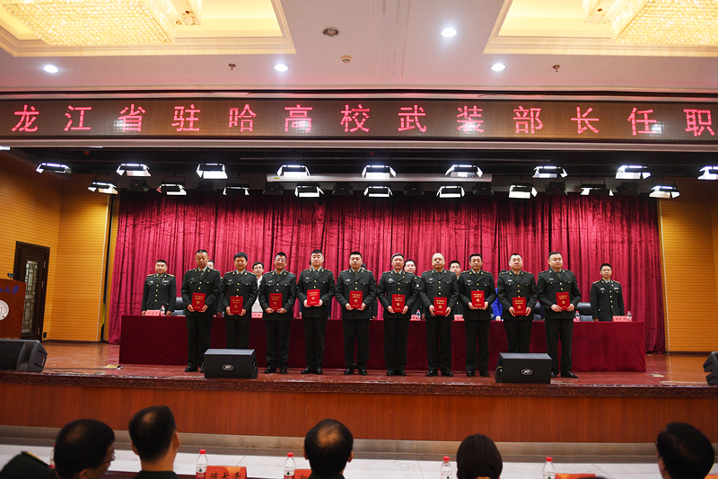 任職儀式在雄壯的國歌聲中開始,首先由哈爾濱警備區司令員于興邦宣讀駐哈高校武裝部長任職命令,參加此次活動的軍地領導為駐哈高校武裝部長任職代表頒發任職證書。
