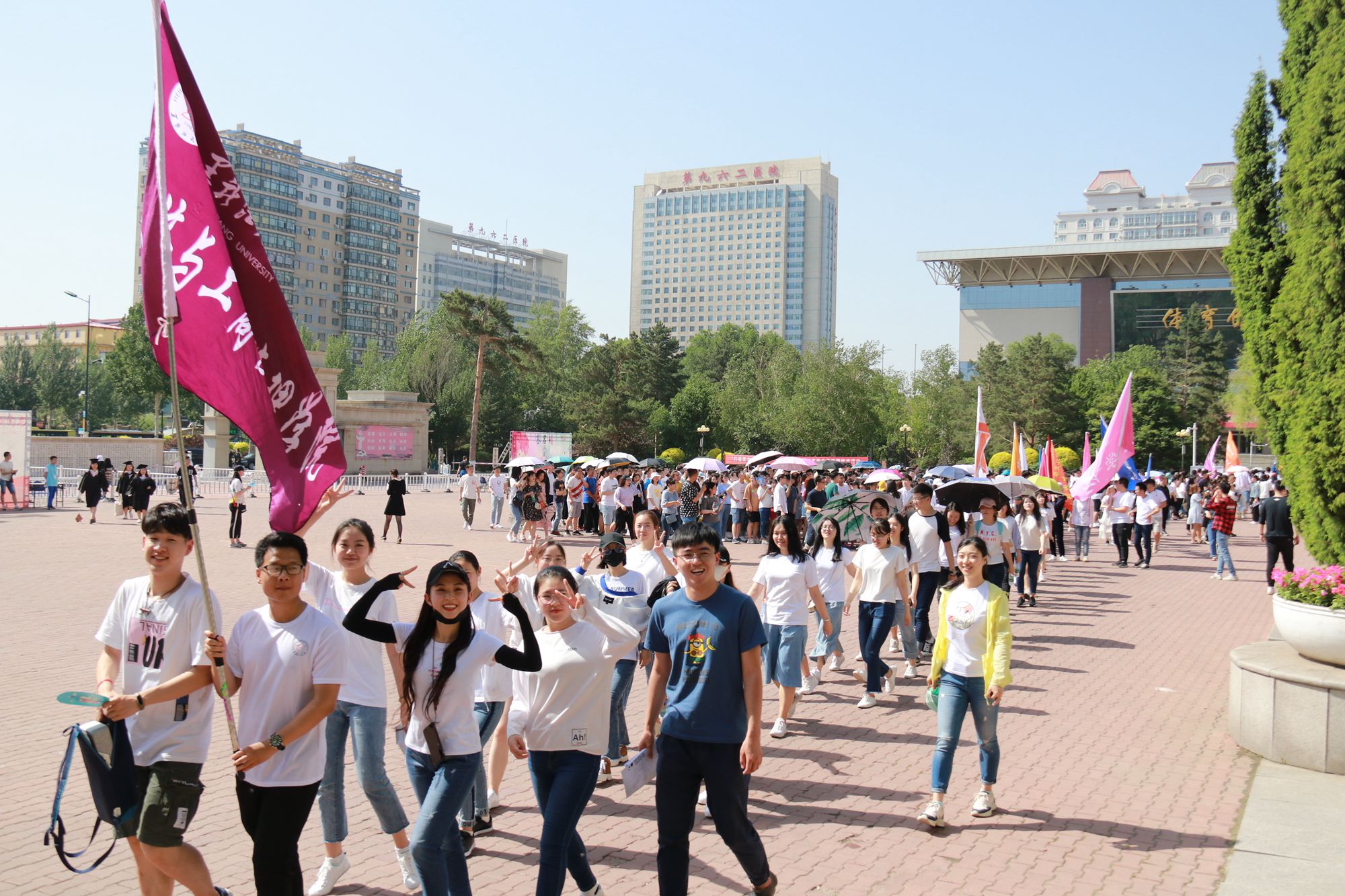 各學院主管學生工作負責人向學院代表隊授旗。在各學院輔導員及旗手的統一帶隊組織下,畢業生們以學院為單位在主樓廣場統一集合并按賽程順序依次列隊出發。