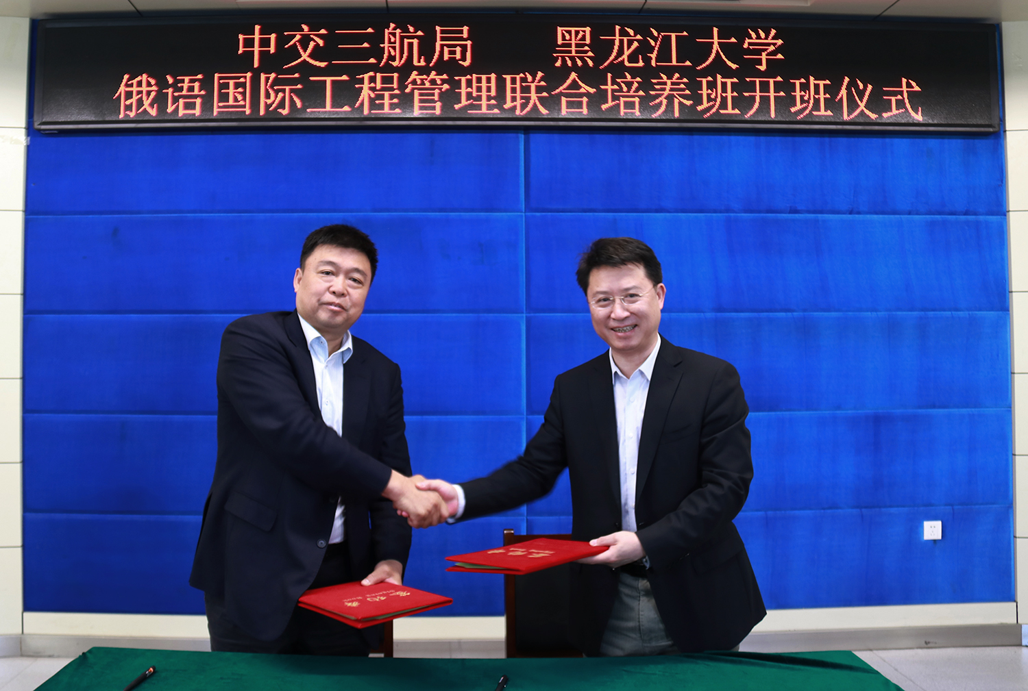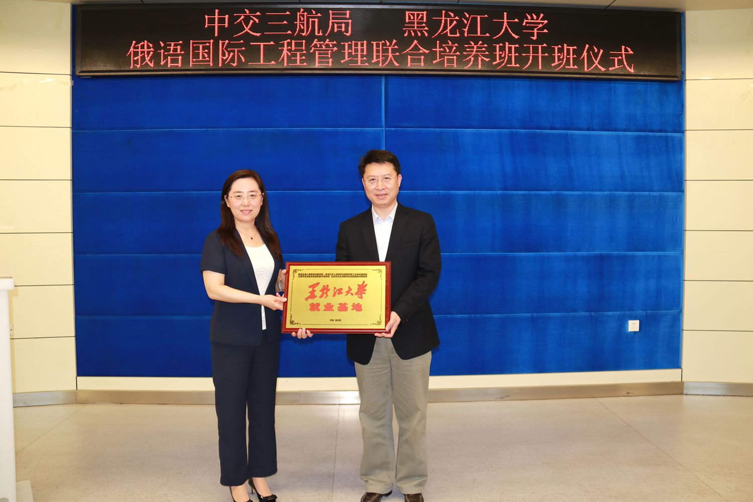 期間,校黨委副書記丁宏為中交三航局柏鈞部長授予黑龍江大學(xué)就業(yè)基地銅牌。副校長嚴(yán)明與中交三航局柏鈞部長簽訂黑龍江大學(xué)俄語國際工程管理聯(lián)合培養(yǎng)協(xié)議。教務(wù)處處長吳華洋和中交三航局海外事業(yè)部副總經(jīng)理張林共同為2020屆培養(yǎng)班授予班牌。