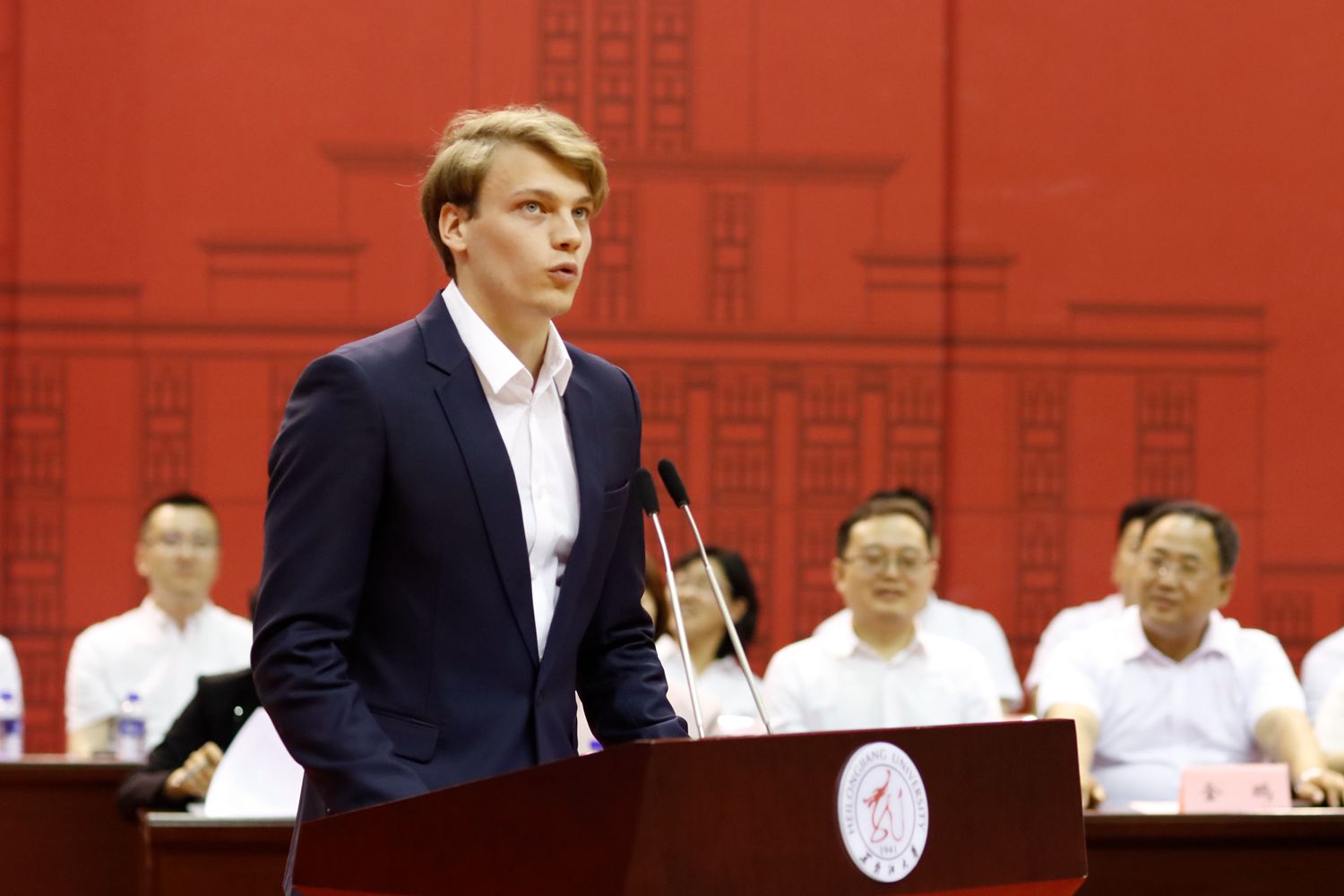國際文化教育學院學生,來自俄羅斯的波多科里托夫·馬克西姆代表留學生畢業(yè)生發(fā)言。他感謝母校帶給他的知識、經(jīng)驗和友誼,在黑大學習期間,他感受到了中華文化的魅力、語言的博大精深、中國人民的熱情,他愛上了中國,愛上了黑龍江這片黑土地。他深情地說,無論未來走到哪里,這里的一切,都將成為畢生難忘的經(jīng)歷。