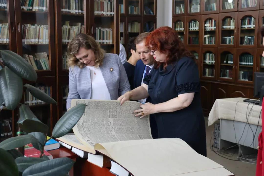 隨后,代表團(tuán)一行參觀了俄語(yǔ)資料中心暨成果展?,F(xiàn)場(chǎng)翻閱了《真理報(bào)》等珍貴的文獻(xiàn)資料,對(duì)中心及工作人員的用心收藏十分贊賞。嚴(yán)明副校長(zhǎng)就我校俄語(yǔ)教學(xué)情況及中俄辦學(xué)進(jìn)行了簡(jiǎn)要介紹,雙方進(jìn)行了交流。