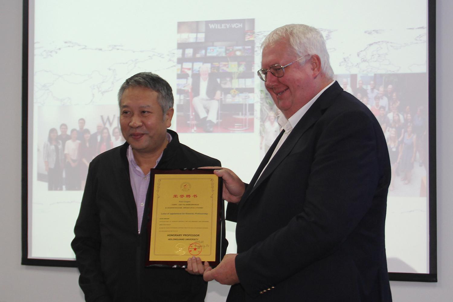 報告會結束后,我校校長付宏剛向Peter Gregory博士授予黑龍江大學榮譽教授稱號。(攝影:李澤瑞 李冉冉)