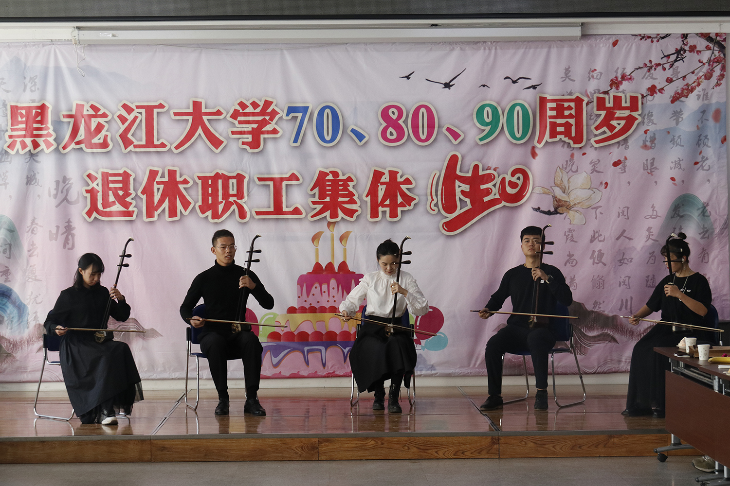 活動現場,藝術學院的師生為退休職工們獻上精彩演出。小合唱《幸福山歌》歌聲嘹亮、二胡表演《光明行》經典再現、二重唱《不忘初心》動人心弦、重唱《團結就是力量》、《絨花》和《祖國不會忘記》情感豐沛、獨唱歌曲《黑大情懷》表達了黑大人對學校的深切情懷。《我們的生活充滿陽光》、古箏《鶯囀黃鸝變奏曲》柔情美妙,《陽光路上》深情高亢。在歡聲笑語、滿滿的祝福中本次集體生日會圓滿結束。