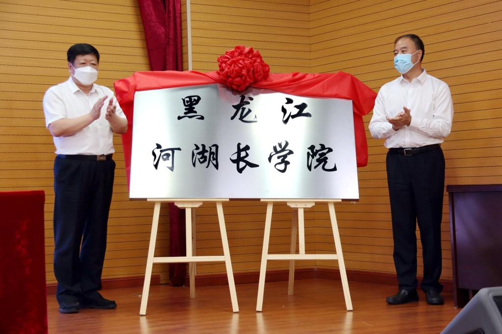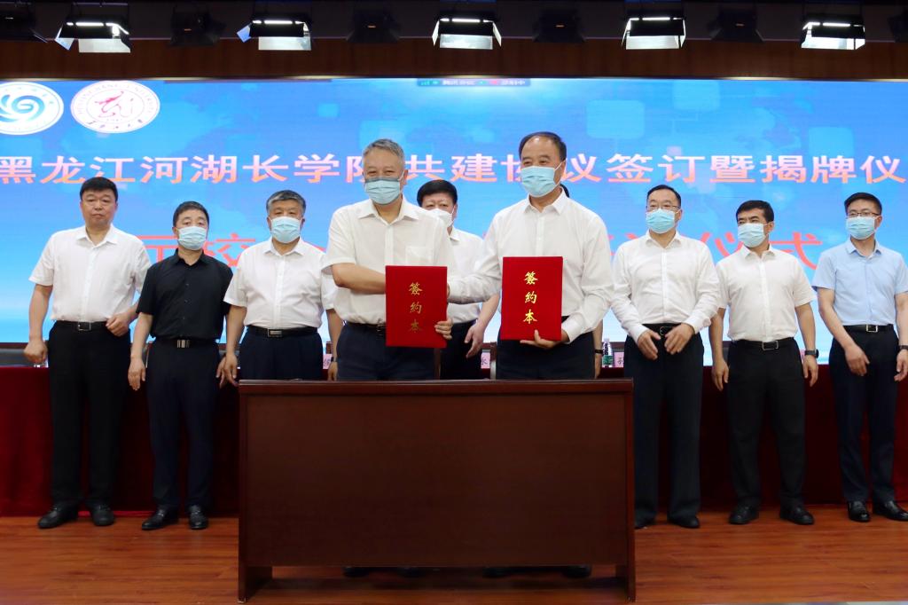 儀式上,侯百君廳長和付宏剛校長簽訂了共建協議,侯百君廳長和王永清書記為黑龍江河湖長學院揭牌。