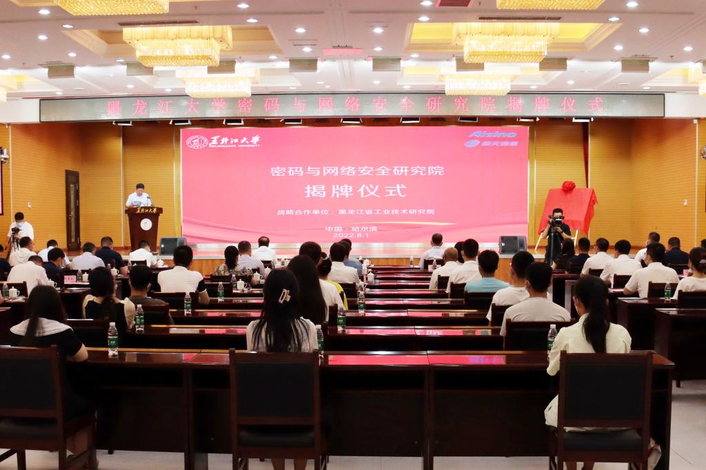 儀式上,黑龍江大學(xué)黨委書記王永清、黑龍江省國(guó)家密碼管理局局長(zhǎng)黎廣波、黑龍江省工業(yè)技術(shù)研究院院長(zhǎng)付強(qiáng)、航天信息股份有限公司加密經(jīng)濟(jì)事業(yè)部總經(jīng)理王申共同為“黑龍江大學(xué)密碼與網(wǎng)絡(luò)安全研究院”成立揭牌。