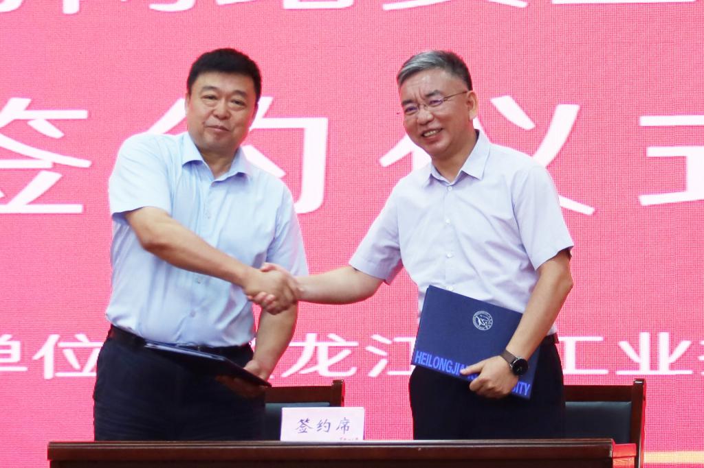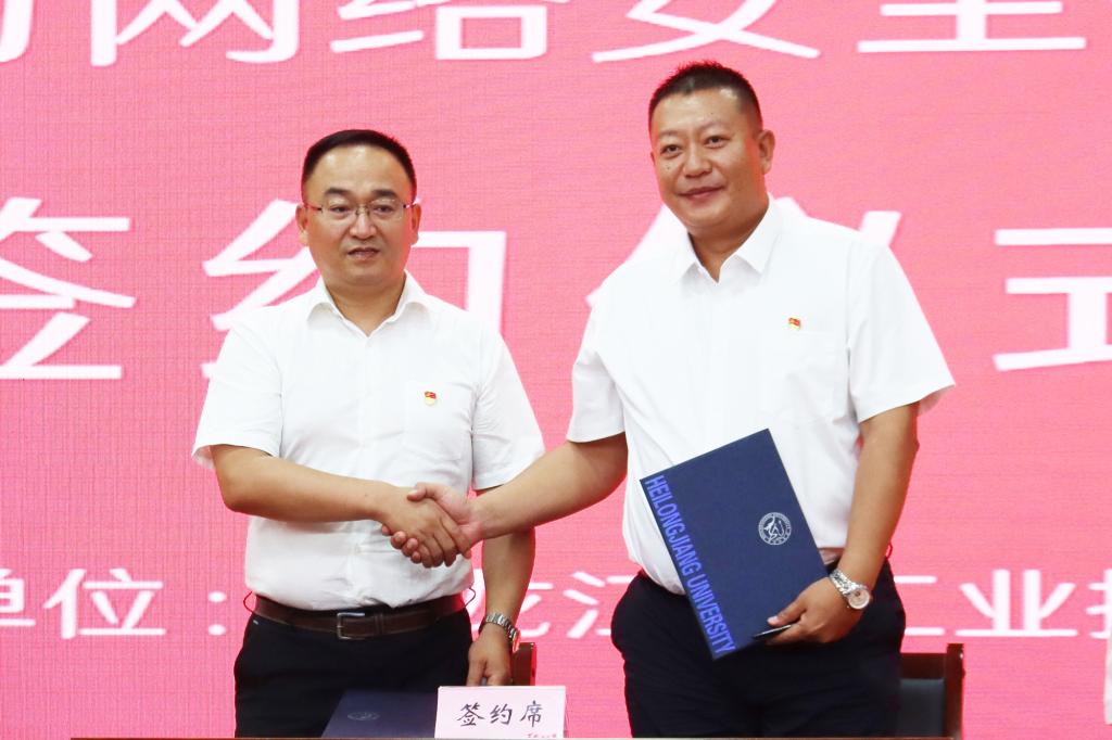 黑龍江大學(xué)密碼與網(wǎng)絡(luò)安全研究院院長(zhǎng)唐孝敏與黑龍江航天信息有限公司總經(jīng)理任海鵬簽署共建協(xié)議。