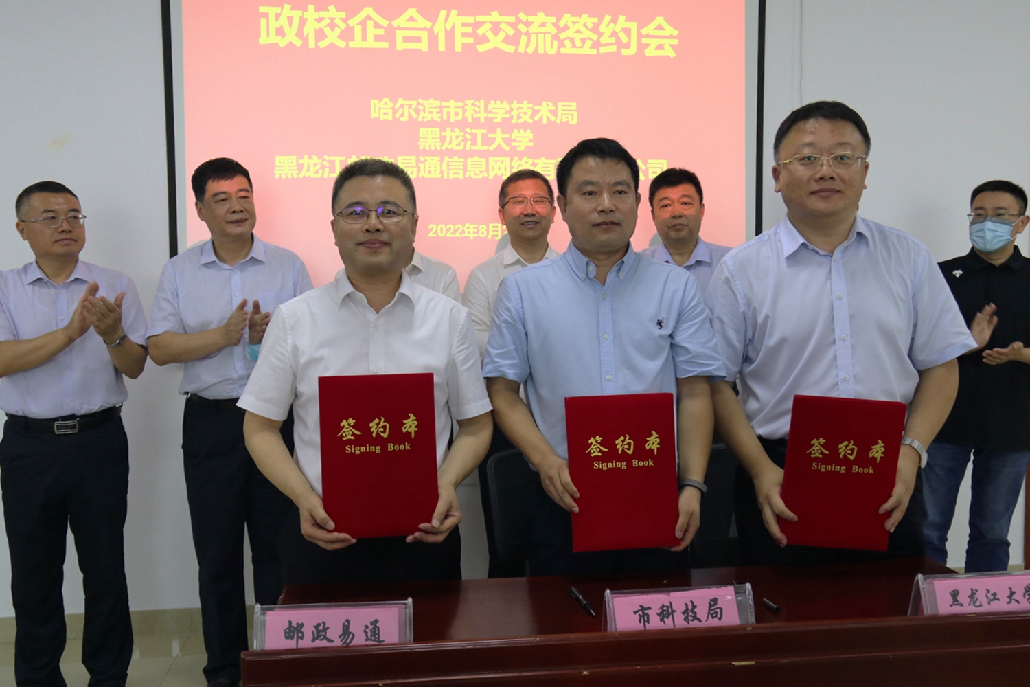 8月2日上午,哈爾濱市科學(xué)技術(shù)局-黑龍江大學(xué)-黑龍江郵政易通信息網(wǎng)絡(luò)有限責(zé)任公司政校企聯(lián)合人才培養(yǎng)協(xié)議簽約儀式在市科學(xué)技術(shù)局舉行,副校長(zhǎng)嚴(yán)明,哈爾濱市科學(xué)技術(shù)局局長(zhǎng)宋博巖、副局長(zhǎng)趙雷,中國(guó)郵政集團(tuán)黑龍江省分公司副總經(jīng)理邵沛,黑龍江郵政易通信息網(wǎng)絡(luò)有限責(zé)任公司總經(jīng)理?xiàng)钏奢x、副總經(jīng)理張瑜瑾出席簽約儀式。我校教務(wù)處、研究生院、科學(xué)技術(shù)處、電子工程學(xué)院有關(guān)負(fù)責(zé)同志以及哈爾濱市科學(xué)技術(shù)局、黑龍江郵政易通信息網(wǎng)絡(luò)有限責(zé)任公司代表參加了儀式,簽約儀式由市科學(xué)技術(shù)局副局長(zhǎng)趙雷主持。
