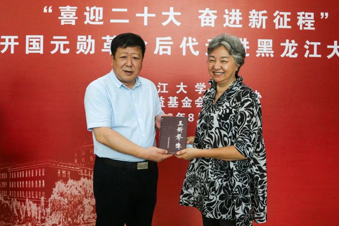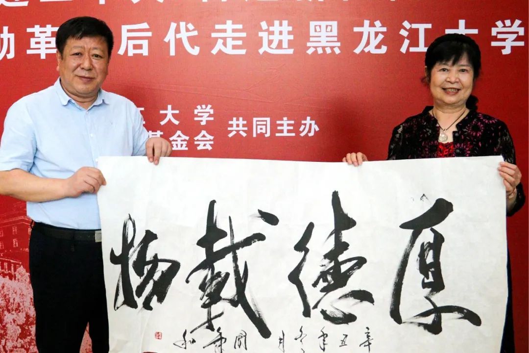 王永清書記代表學校向東北抗聯、東北野戰軍后代,景華公益基金會會長張景華女士贈送“八秩弦歌”黑龍江大學80周年校慶歷史長卷。
