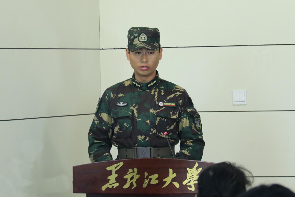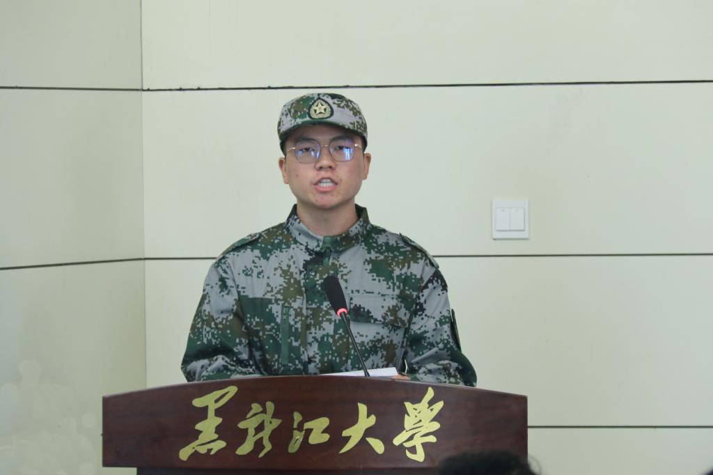 隨后,退役大學生士兵代表和入伍新兵代表分別發言。在校退役大學生士兵代表、校退役大學生士兵協會主席、機電工程學院2019級學生孫志鑫發言,他結合自身入伍經歷向在場新兵介紹了參軍體驗、相關政策及學校退役復學政策,并以自身經歷及所獲榮譽激勵新兵在軍營中要強化使命擔當,退役復學后也要退伍不褪色、永葆軍人本色。政府管理學院2021級學生解志遠作為入伍新兵代表發言,他首先對武裝部在同學們參軍入伍過程中給予的指導幫助和人文關懷表示衷心感謝,并代表全體應征入伍學生鄭重承諾,作為一名預定新兵他一定會始終牢記黑大校訓,在軍營中傳承黑大精神,講政治、聽指揮、跟黨走,訓練中不怕苦累,努力將個人理想追求融入強國強軍偉業中。
