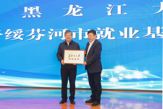 王永清向羅海濤授予黑龍江大學就業基地銅牌。
