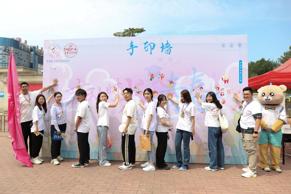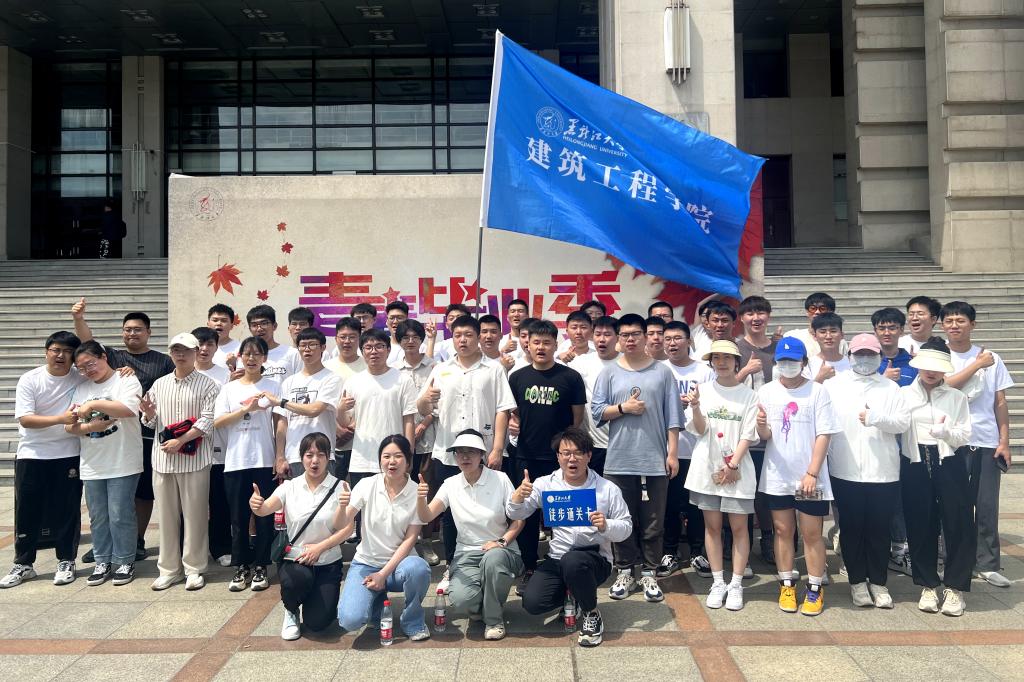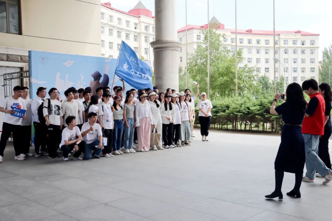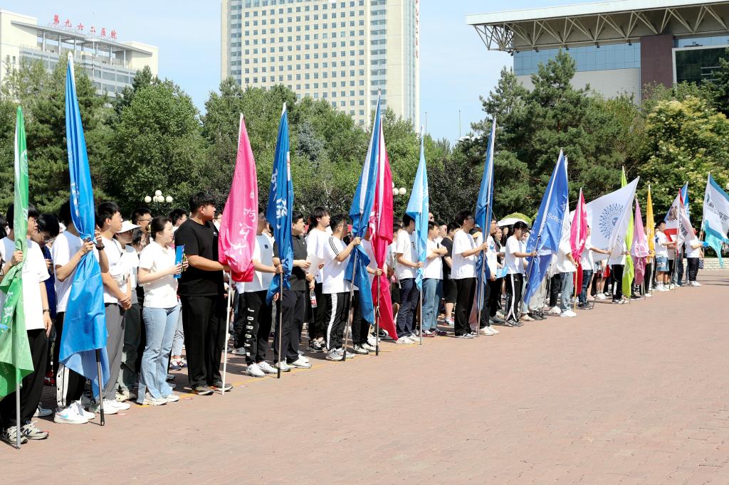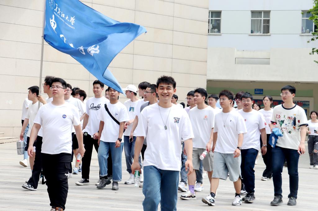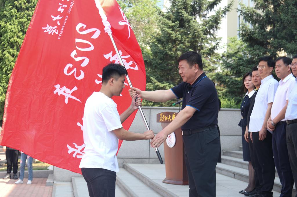 王永清為本次活動授旗。黑龍江省2023屆優秀畢業生獲得者、電子工程學院畢業生黨員郭潤桐接旗。伴隨高揚的旗幟,徒步槍響,活動正式開始,各學院輔導員、旗手、畢業生們以學院為單位依次出發。
