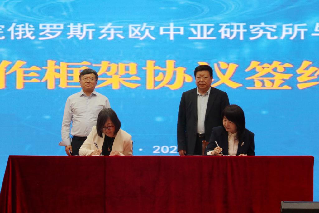 儀式上,金哲與于文秀代表雙方簽署《中國社會科學院俄羅斯東歐中亞研究所與黑龍江大學戰略合作框架協議》。