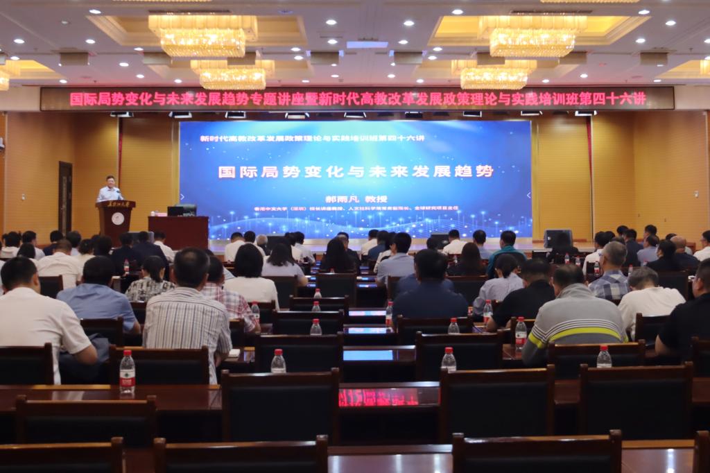 為推動主題教育走深走實,教育引導廣大黨員干部深刻感悟黨的創新理論的實踐能力。按照學校主題教育工作安排,6月20日下午,我校在主樓一樓報告廳舉辦國際局勢變化與未來發展趨勢暨新時代高教改革發展政策理論與實踐培訓班第四十六講。香港中文大學(深圳)校長講座教授、人文社科學院常務副院長郝雨凡擔任本次專題講座的主講人。副校長李卓主持活動。