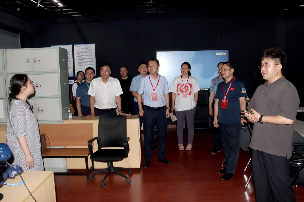 在匯文樓創客中心,講解員向專家組介紹了創客中心的特色與成就,并向專家組介紹、展示虛擬仿真教學平臺的使用以及在PC端的模擬銷售為教學提供的沉浸式情景。
