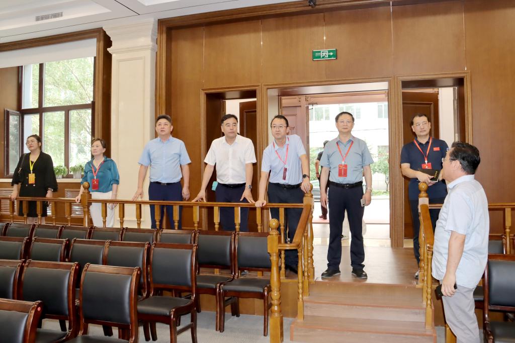 隨后專家組一行走訪參觀我校模擬法庭、藝術樓數字化創意設計藝術實驗中心、匯文樓創客中心。在模擬法庭,講解員向專家組簡要介紹了模擬法庭的基本情況,并表示將在模擬法庭開設公共法治大學堂,充分發揮其開放共享的作用。專家組成員對模擬法庭的建設表示充分肯定,并合影留念。