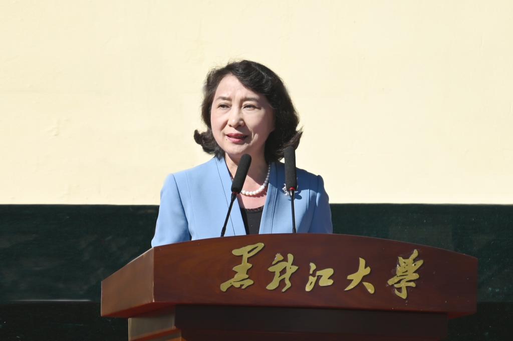 王敬波在開學典禮上講話,并為新生講授“開學第一課”。她代表全校師生對2023級新生的到來表示熱烈歡迎,向辛勤撫育他們的師長和親友表示衷心感謝。她表示,黑龍江大學根于延安、源于抗大,伴隨著中國共產黨帶領中國人民救亡圖存、復興逐夢的鏗鏘腳步,從寶塔山下到松花江畔,延安精神和北大荒精神融入學校血脈。建校82年來,一代又一代的前輩志存高遠、愛國奉獻、艱苦奮斗、自強不息。延安窯洞的燭光和沙曼屯上的小樹見證了學校從軍事院校俄文隊到獨立的俄文學院,從外語類單科學校到學科門類齊全的綜合性大學,從省屬高校到省部共建高校的歷史性跨越。她希望同學們能夠以主人翁的姿態,主動融入“命運共同體”,傳承愛國奉獻的優良傳統,把“心有大愛,至誠報國”的濃厚情感貫穿學業全過程,把愛護學校、建設學校、支持學校作為一生的責任和使命。